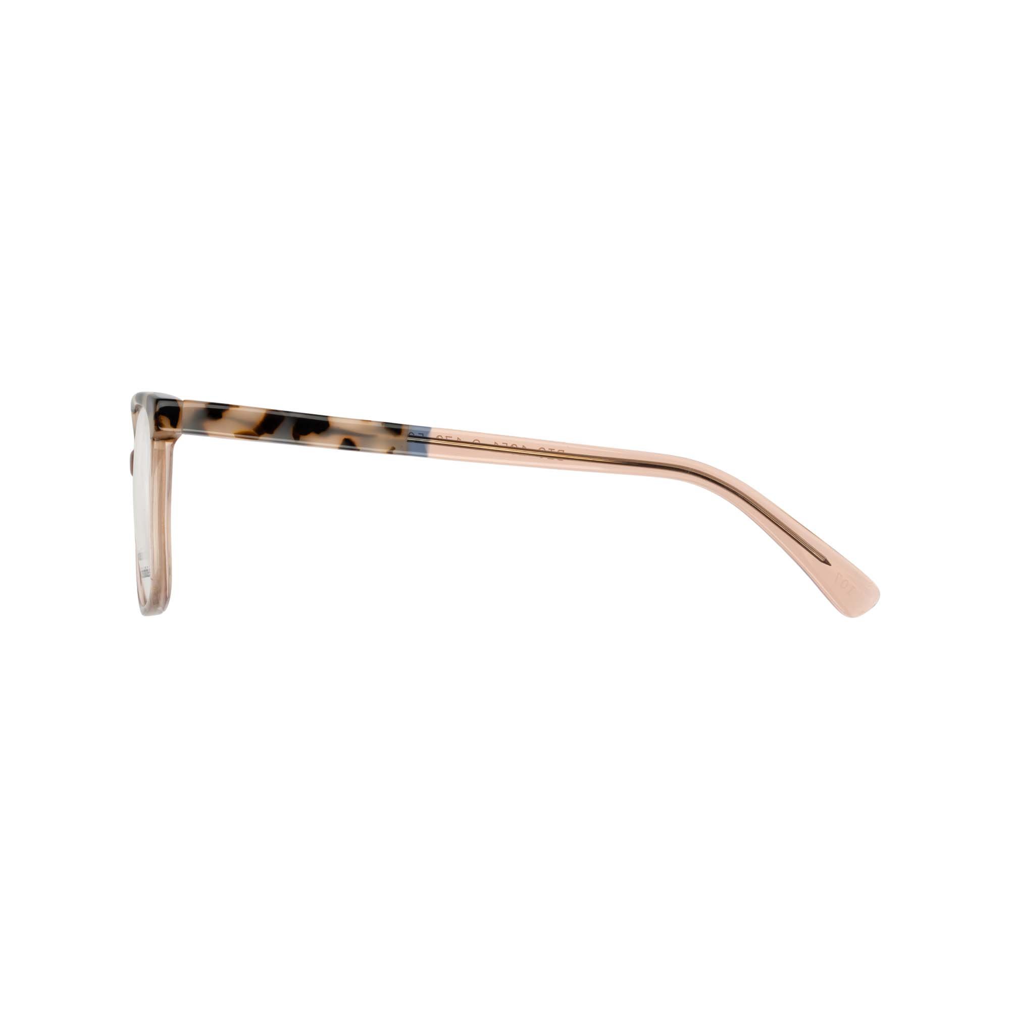 Available in a tonal nude crystal with high impact coral tips (C1) or clear crystal with modern mint temples (C2). Temples are Stainless Steel, for strength and stability adding a practical edge. The frame is complete with self-locking screws.