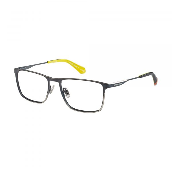 Flat sheet metal large rectangular shape with bevelled detail on front and temples. Featuring spring hinges and three colour signature temple detail